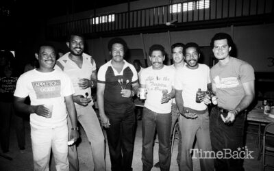 Promotional photoshoot for A. L. Thompson's Cayman Islander Nightclub, featuring the band 'Chuck & Barrie with Odyssey', 1984.